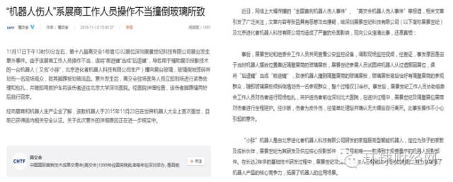 11月18日下午,高交会官方微博做出说明(见图片),澄清事故原因是人为操作不当。随后,机器人厂商、参展厂商也做出说明,指出是参展人员误操导致。